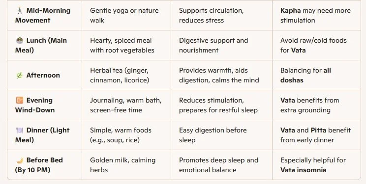 Mid-morning is a great time for gentle movement. A nature walk or slow yoga session helps improve circulation and reduce stress. Kapha types may benefit from slightly more vigorous activity to stay energized.