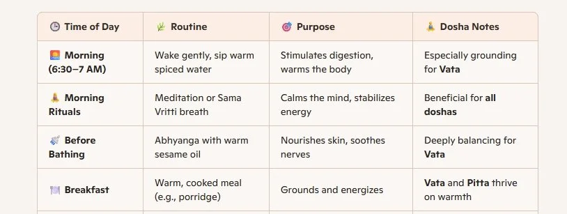 Stick to Routine: Vata thrives on consistency, regular meals, sleep, and self-care rituals are key.
